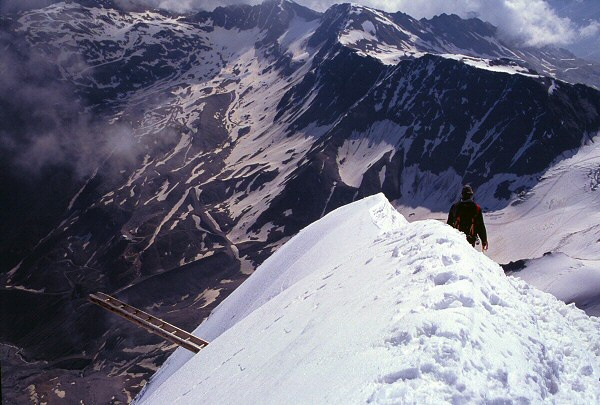 Appena iniziata la discesa lungo la normale troviamo questa curiosa scala sospesa sul versante nord. (!?!?)