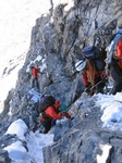 Probably the most beautiful ridge climb to reach Ortles summit. Climbed by the Advanced Alpinism course of the Scuola Silvio Saglio alpinism school in Sep 2004 and after a snow flurry that provided an even more spectacular scenario.